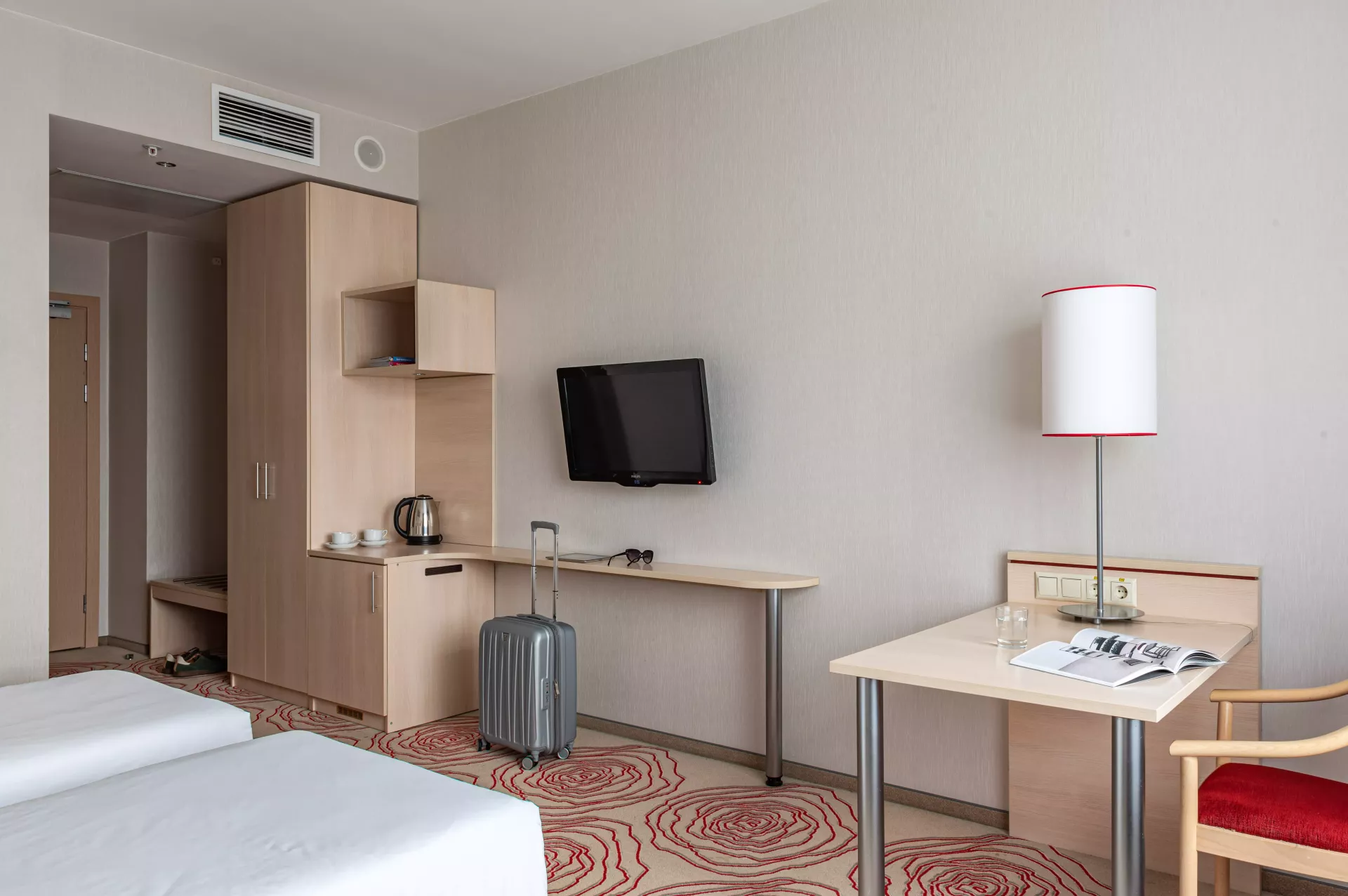 Чистый отель, номера свежие после ремонта. Светлый интерьер, просторный санузел с душевой. Не хватило гигиенического душа. На полу в комнате ковролин, в туалете теплый кафель. Халаты, тапочки в номере. Вода в бутылках по 0,6 питьевая. Есть фен, порадовали гель для душа, шампунь, кусковое мыло, чепчики для душа и зубные наборы. Матрасы, подушки удобные, белье белоснежное. Есть шкаф с плечиками, полочками, сейф. На нашу семью дали 2 карточки. У нас входили завтраки (шведский стол), также мы посетили этот ресторан на ужин (за шведский стол взрослому вход - 1450р, ребенку от 6 лет 750р, до 6 лет бесплатно. Красивый интерьер в ресторане, есть небольшой игровой уголок, питание очень понравилось! Вкусно, сытно. Отдельно хотелось отметить салат «Мимоза», он божественный! Есть платный паркинг наземный и отличный подземный. Персонал вежливый, работает оперативно. От души рекомендую отель. Спасибо!